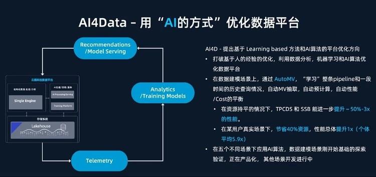 因此,在 AI 已经成为计算领域一等公民的今天,云器科技探索推动一个 AI4D(AI for Data)的新方向,通过平台自主学习数据和负载的特性,做基于算法和 AI 的自动化调整,来满足多变的业务需求,让每一位企业人员都能低门槛使用数据平台。AI4D (AI for Data)指的是基于 Learning based 方法和 AI 算法的平台优化方向。