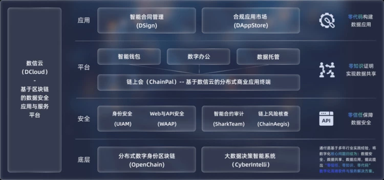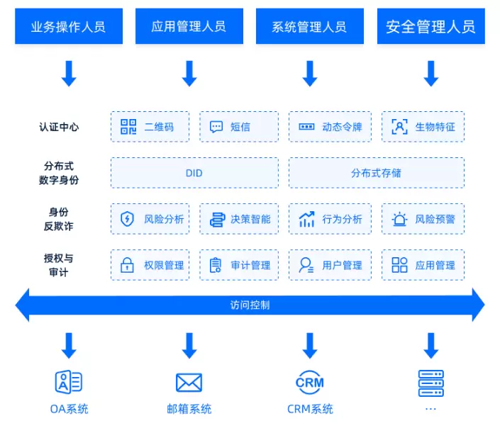 以分布式数字身份为核心,将身份安全、网络安全、应用安全、数据安全等各个层面动态地集成在一起,利用分布式“数字身份”技术解决传统“数字身份”管理难题。消除隐式信任问题。提供包含统一用户管理、账号管理、权限管理、访问控制、审计管理和应用管理的整体解决方案,实现各业务应用身份认证的横向集成、纵向贯通、信息共享服务,提升企业系统安全性、可管理能力、服务质量和用户体验。