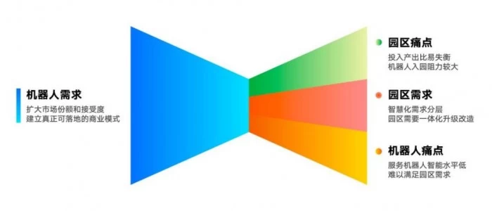 智慧园区的本质其实代表人们对于这个园区的一个美好愿景,这个愿景就是要以可接受的成本为用户提供更多服务。面对园区的智慧化升级,机器人企业需要有不可替代的价值和更高维度的考量。园区要的是智慧化升级,而并非是仅作为景观的机器人。