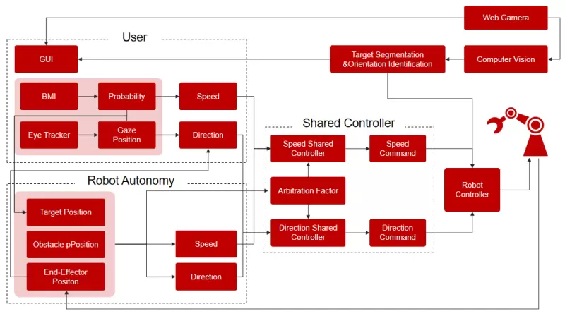 该技术的关键点之一是混合凝视BCI的应用。该技术结合了凝视跟踪和脑机接口技术,通过离散选择模式和连续速度控制模式实现对机器人的控制。在离散选择模式下,用户通过凝视来输入目标位置,然后自动切换到连续速度控制模式,根据用户的速度命令将机械臂末端执行器移动到目标位置。