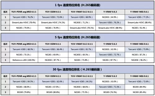 H.265标准也是当今互联网应用的主流格式,腾讯通过对V265编码器直播和点播能力的持续优化,多年来在H.265赛道一直保持行业领先。本次在H.265赛道三个速度档位15项指标中,获得总计12项第一。以常用的YUV-SSIM指标为例,V265在1fps/5fps/30fps分别实现了相比x265 27.4%、33.6%和37.4%的码率节省。