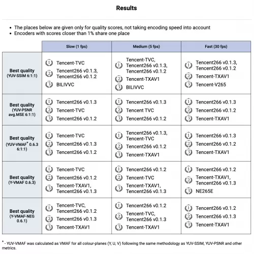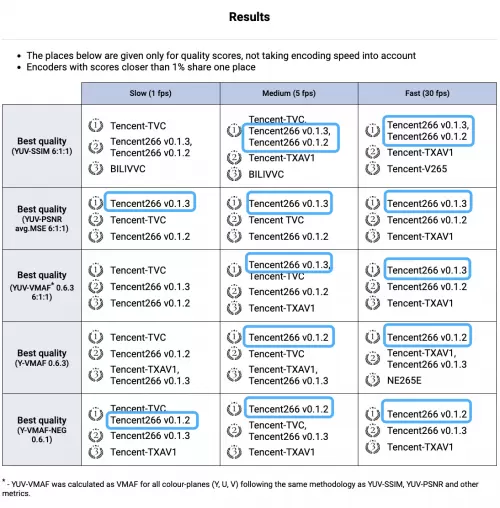 MSU大赛官网比赛结果, Tencent266各类编码器最多第一(15个指标12项第一)