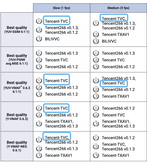 其中,Tencent266在全场各类编码器总计15项指标中取得12项第一,第一总数最多;首次参赛的Tencent-TVC编码器在压缩率最高的1fps速度档位表现优异,所有5项指标取得4项第一。