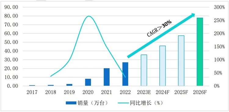 根据 GGII 统计,2022 年中国公共服务机器人产量已经达到 10.24 万台,同比增长 30.61%;预计未来几年复合增速超 27%,到 2026 年产量有望达到 27 万台。