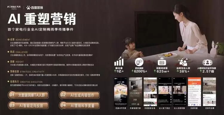 这次,百度营销联手方太消毒柜的全新广告片,将AI技术真实应用于灵感洞察、内容生产、智能投放和营销科学当中,从投前到投后,找到梅雨季场景和母婴人群、AIGC视频脚本和分镜、圈定高潜人群进行投放并使用AIA营销科学度量生成式AI的营销效果,从策划到上线7天时间,实现亿级曝光和2.57倍于行业互动率的效果。