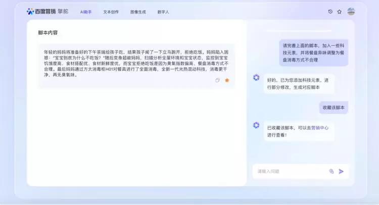 根据梅雨、婴幼儿母亲,方太消毒柜创新H01等关键词,擎舵平台很快生成了脚本,并配合多次修改,根据提示加入科技感和产品亮点,完善创意。