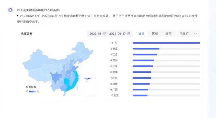 借助百度指数AI系统,方太发现在5月17日到6月17日期间,消毒柜搜索量陡升,经过分析后发现,是梅雨季的暴雨容易导致细菌滋生,很多用户正在提前挑选相关产品。百度营销的指导推荐,方太在梅雨季期间针对高敏感的母婴人群,开展营销活动。