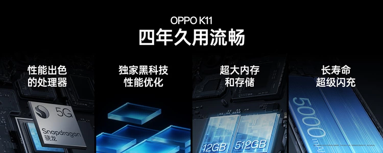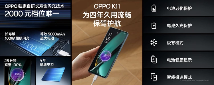 不止影像,OPPO K11还从续航、性能及存储技术方面入手,以旗舰标准为K11打造四年流畅体验。先看看续航方面,OPPO K11配备了长寿版100W超级闪充+5000mAh超大电池,最快26分钟可将电池从1%充到100%,可做到充电5分钟刷短视频3.14小时。同时,该机还延续了电池健康引擎和智慧充电引擎两大科技,可有效保护电池健康,降低电池老化衰减率,延长电池使用寿命,为四年流畅提供续航支撑!