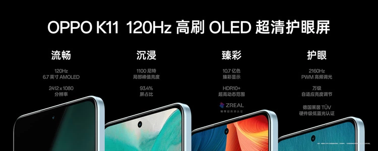 此外,OPPO K11在其它配置上也做到了全面均衡无短板。正面为一块6.7英寸120Hz高刷OLED超清护眼屏,并且支持2160Hz高频PWM调光,万级自适应亮度调节;还有搭载封闭式立体声双扬声器和旗舰级的X轴线性马达为游戏影音体验加分,当然红外遥控、多功能NFC也一个不落。