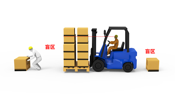 我们看到的叉车通常都是360°的“天窗”,但实际上仍存在很多区域是超出驾驶员视野范围的。这些盲区一方面是由叉车的自身构造引起:叉车前后方的两个升降缸和四个承重处均会造成驾驶员部分视线遮挡;另一方面,货物堆放较高阻挡司机视野也会导致视野盲区;此外,在路口拐角处、出入口,都会形成不同程度的视线盲区。一旦盲区内存在行人、车辆及其他障碍物,就会直接引发盲区撞车事故,轻则造成货物损伤,重则导致人员伤亡。