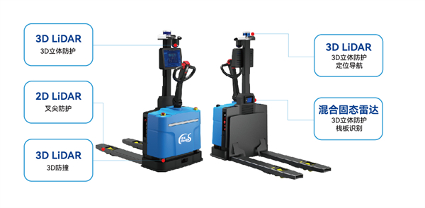 镭神智能多线激光雷达3D SLAM无人叉车最高配置8颗自研自产的激光雷达用于重构三维立体环境、栈板识别以及安全防护,整机成本依然具备超强竞争力。