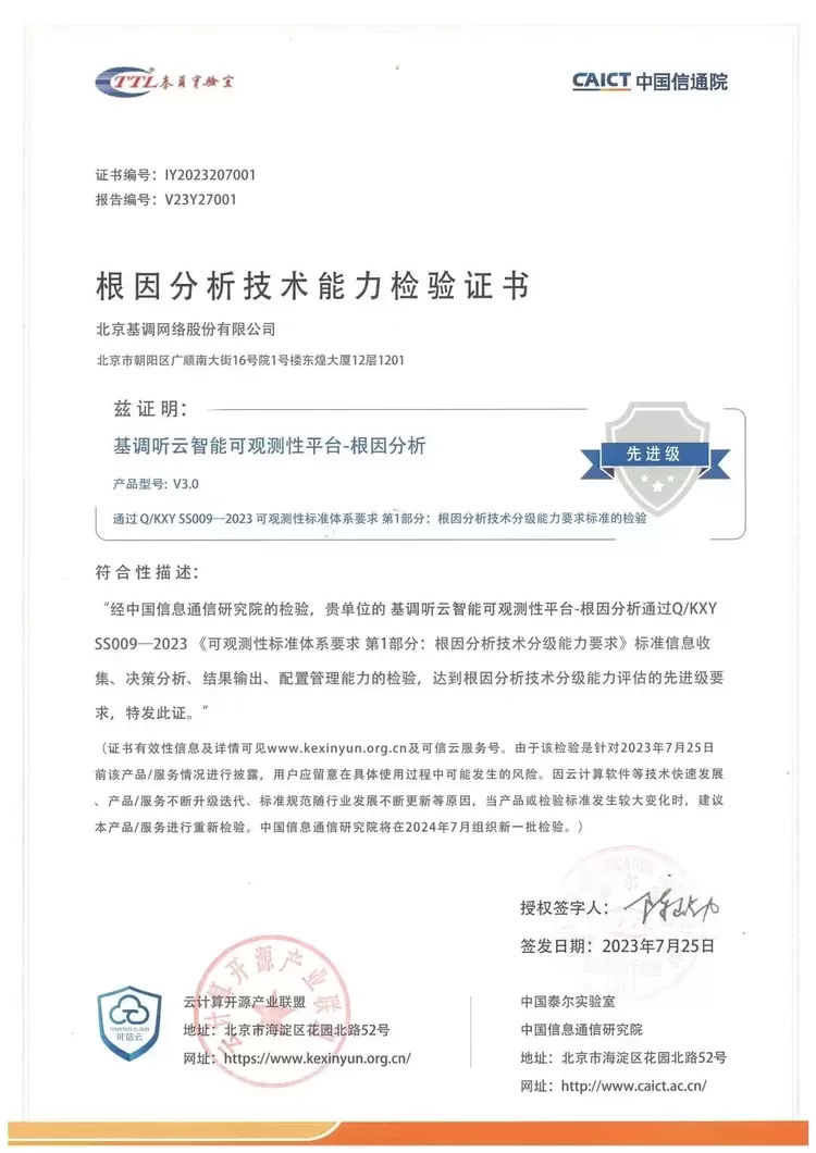 值得一提的是,在这次大会上,基调听云可观测性平台凭借其稳定性和卓越的根因分析能力受到了广泛关注。基调听云可观测性平台在中国信通院举办的“稳保行动”中通过了根因分析能力的评估,成功获评为首批先进级!此前,基调听云可观测性平台已通过信通院可观测性平台首批先进级评估!此次大会上的发布更是为基调听云可观测性平台的成就正式加冕,并彰显了基调听云在可观测性领域的领先地位。