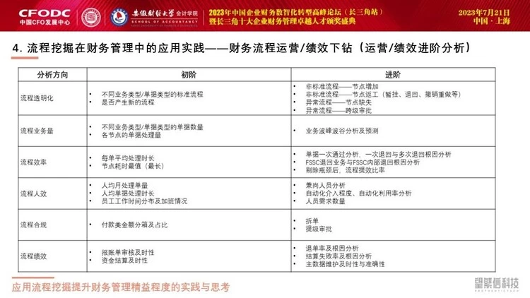 在演进过程中,汪智鹏向在座的财务负责人们问了一个问题,贵公司财务流程标准化程度能达到多少?他提出流程挖掘是完成标准化的一个重要方法——企业可以基于数据和流程,借助模型来量化标准化程度;同时,通过一致性分析,流程挖掘可以帮助企业识别非标原因,并进一步区分它们是否是有价值的非标准流程,或是异常流程。例如,跨级审批、提及审批或拆单等非标准行为,都能被识别并生成更符合财务管理的绩效指标,从而提升企业整体运营健康度。