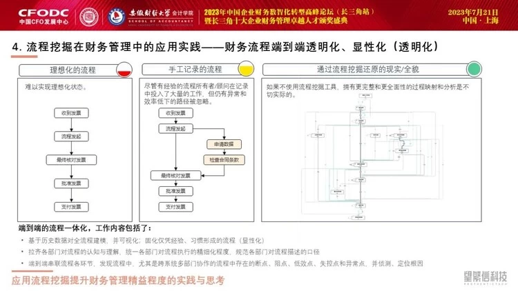 活动现场,望繁信科技合伙人、财务兼售前负责人汪智鹏带来《应用流程挖掘提升财务管理精益程度的实践与思考》主题分享,与知名上市公司CFO、央国企总会计师、外资企业在华财务负责人、全国会计名家等行业精英,围绕财务精益管理进行了深度剖析和精彩互动,收获了业界广泛好评。