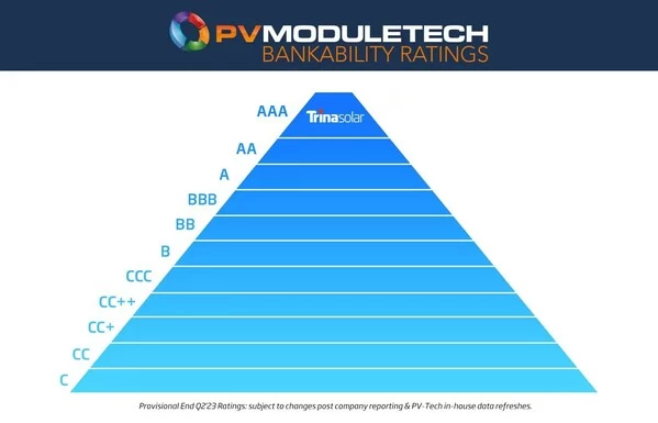 近日,PV Tech发布2023年第二季度组件可融资性评级报告,天合光能凭借先进的技术、领先的210组件出货量、210+N产品的高可靠性和稳健的财务表现等关键指标,再度荣获AAA最高评级。天合光能连续五次蝉联AAA评级,彰显了其光伏行业领军者的地位。