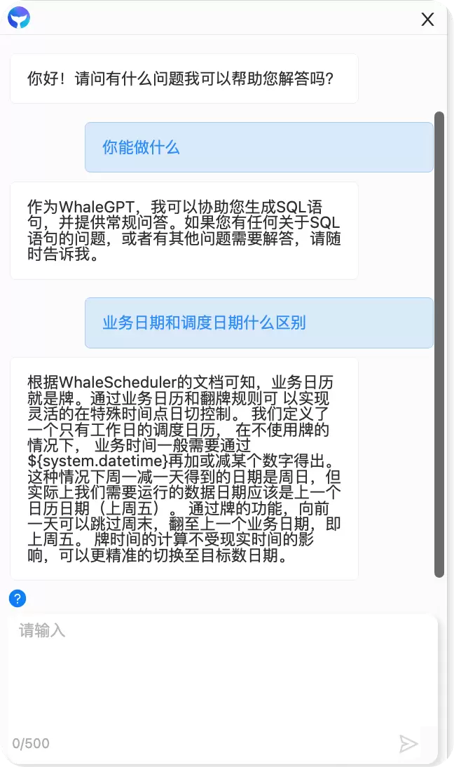 为了降低数据调度系统的使用难度,使数据分析师等业务部门的人员无需代码背景也可以无门槛的进行数据开发和操作调度作业,WhaleScheduler 2.4.5 接入了 WhaleStudio 新增重要模块——WhaleGPT 的 AI 助手,可以辅助业务人员直接完成数据业务脚本开发,让他们更关注业务本身,而不是代码。