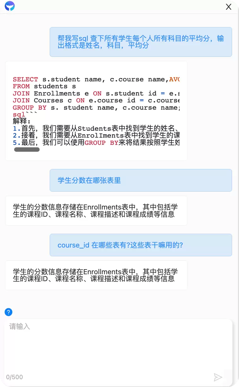 通过对话提出需求让 GPT 生成 SQL 代码,在对话中将自己的需求描述出来,如写查询某某数据的 SQL,返回该需求的 SQL 代码。