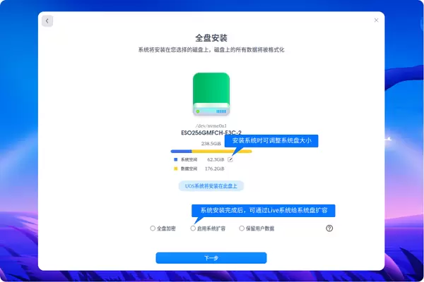 你可以在系统安装过程中自由设置系统盘空间大小,也可以在安装完成后随时进入live模式通过磁盘管理器扩容,再也无需担心系统盘空间不足的问题。