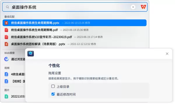 全局搜索结果同名文件太多,分不清?现在搜索结果显示也可以更个性化,通过设置显示文件名后的拖尾属性,比如“最近修改时间”,轻松定位所需文件,再也不用一个一个点开看了。