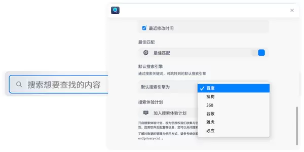 许多国内外用户进行Web搜索时习惯使用自己喜欢的搜索引擎。现在全局搜索支持自定义默认搜索引擎,全球主流搜索引擎任你选择!