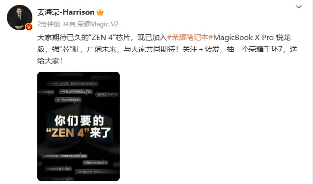 7月26日,荣耀中国区CMO姜海荣微博发文:“大家期待已久的‘Zen4’芯片,现已加入#荣耀笔记本#MagicBook X Pro 锐龙版,强‘芯’脏,广阔未来,与大家共同期待”,宣告荣耀笔记本MagicBook X Pro系列首款锐龙版即将上市。