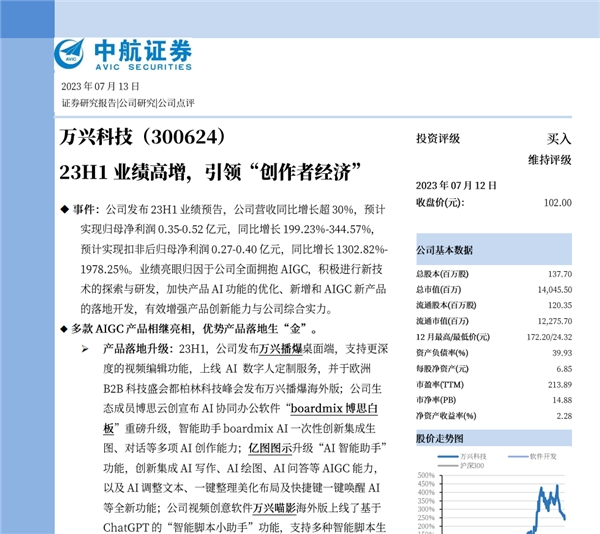 近日,中航证券发布研报,给予AIGC软件A股上市公司万兴科技(300624.SZ)“买入”评级。研报指出,万兴科技2023H1业绩高增,引领“创作者经济”,随着AIGC产品落地及技术研发的持续布局,未来业绩有望迎来新一轮增长。