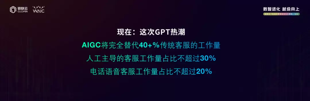 GPT热潮出现后,对行业从业人员有很大触动,我们曾与行业客户一起探讨,假设将ChatGPT应用在业务场景中,完全可以替代40%传统客服的工作量,而且可以做得非常的精准;这使得人工主导的客服工作量占比不超过30%,电话语音客服工作量占比不超过20%,这是经验所得,和之前有很大不同。