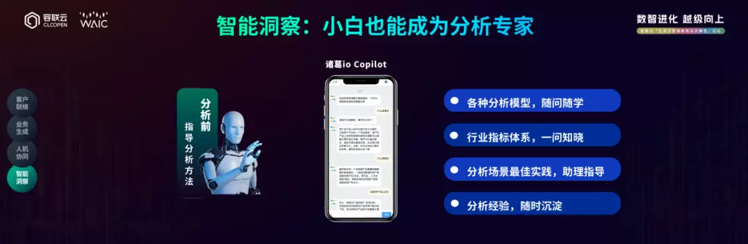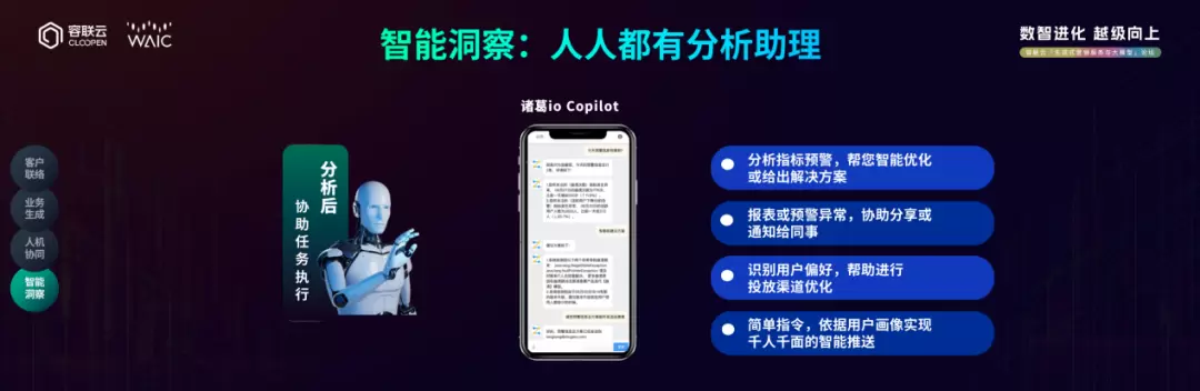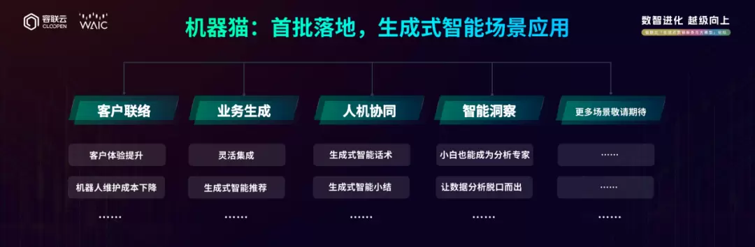 容联云“机器猫”平台提供的生成式智能应用,首批落地四大应用场景,包括客户联络、业务协作、AI辅助、智能洞察。
