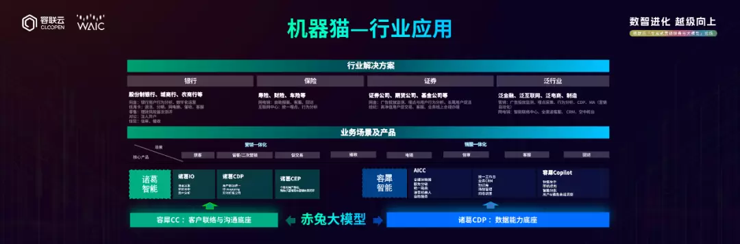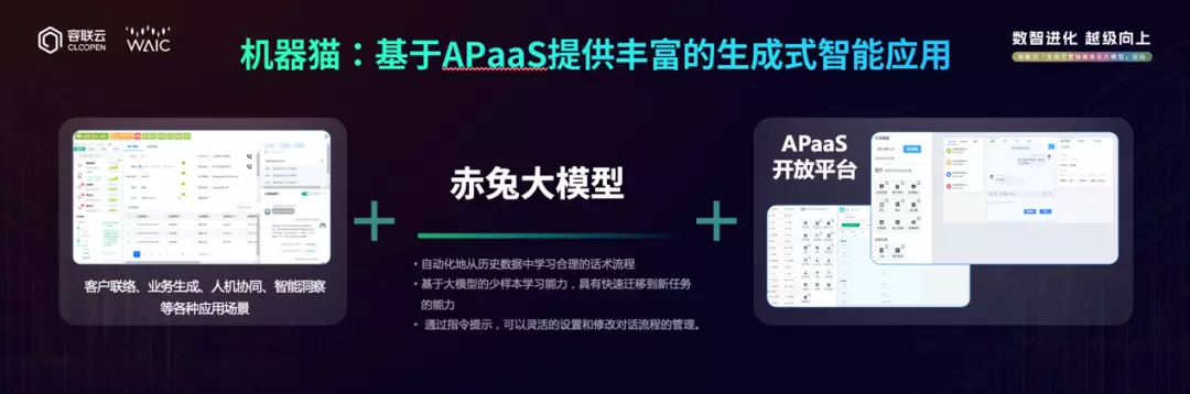 图上在APaaS平台做业务场景的应用,比如说营销平台,以营销为主导,以小客服辅助的,通过拖拉拽的方式,在营销场景当中接入服务相关的功能和模块进来,实现动态实时快速的生成,用APaaS平台在赤兔大模型底座上做更多丰富的应用,这是容联云机器猫整个全新架构产品核心的思想,以业务应用为主导。