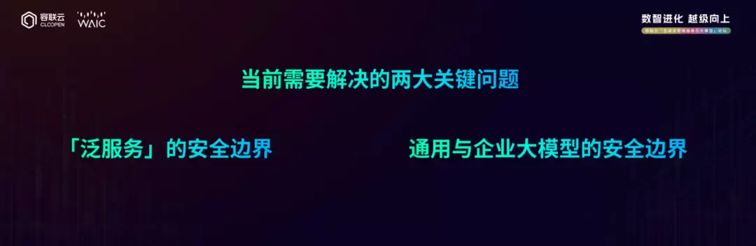但在这其中,有两个非常关键的问题,一方面是企业「泛服务」产品服务,在后台大脑越来越强大的时候、专业领域表现越来越好时,如何保证企业内部的敏感、隐私数据的安全?另一方面是,如何把通用和企业大模型的安全边界做好,这是之前所没有考虑过的事情。