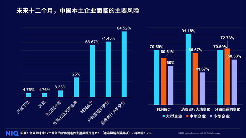 报告显示,未来十二个月,受访的中国本土企业面临的最主要风险为消费者行为的变化(84.52%)、分销渠道的变化(71.43%)和利润减少(66.67%),其中,大型企业最关心消费者行为变化,而中小企业更关心分销渠道变化。纵观全球,通货膨胀是受访的欧美快消品企业最关注的外部风险。
