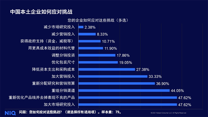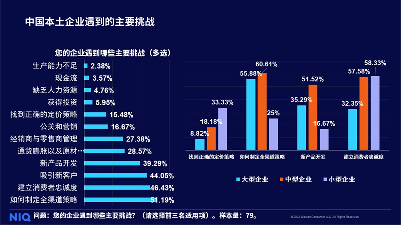 今日,全球领先的消费者研究与零售监测公司尼尔森IQ发布《2023年全球快消品企业调研——中国本土企业篇》,通过调研中国快消品企业,洞察后疫情时代中国企业所面临的行业现状,了解其渠道布局与产品定价策略,以助力本土企业制定更符合市场环境的渠道布局与市场策略。