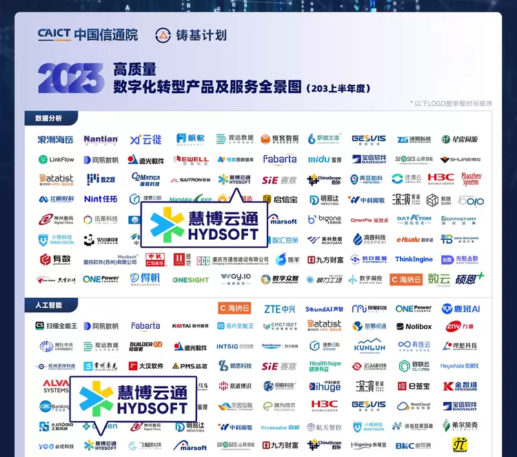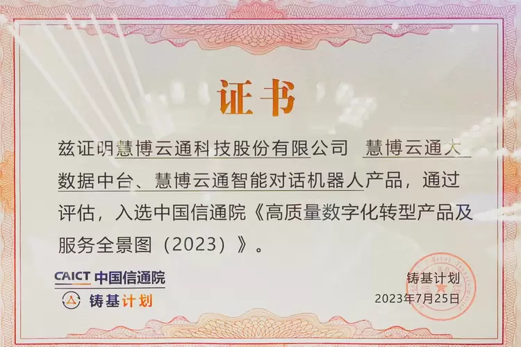 7月27日,中国信息通信研究院主办的“2023数字生态发展大会”在北京召开。会上正式发布了《高质量数字化转型产品及服务全景图(2023上半年度)》(以下简称《全景图》)。慧博云通科技股份有限公司凭借先进的技术能力和十余年客户多场景应用理解,实力入选此次《全景图》“人工智能”和“数据分析”技术产品业务能力板块。