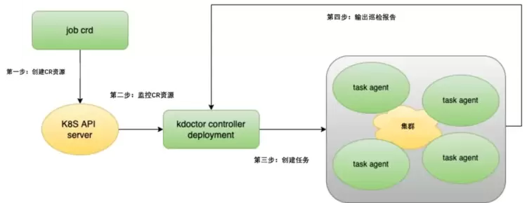 (1)Kdcotor controller,主要的工作是实施巡检任务的管理。当管理员下发具体的巡检任务 CR 时,Kdcotor controller 就会动态启动一组相应的 task agent pod 来实施。