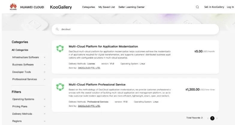 现在用户可以直接登录华为云云商店(国际站),采购「DaoCloud 道客」相关产品和配套服务。华为云云商店对于入驻商家进行了层层把关,综合评估了服务商及商品的市场竞争力,并全程提供担保交易、服务监管和退款售后无忧服务。