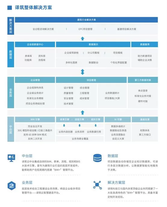 历经上万个各类型企业多业态项目的打磨,结合600余家企业的个性化管理需求,译筑科技逐步推出译筑云智慧建造整体解决方案,其中包含译筑云三维数智中台、译筑云智慧建造平台和建筑行业各类解决方案。
