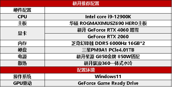 为发挥出显卡的全部性能,本次测试采用了强劲的Intel core i9-12900K进行搭配。主板方面选择了ROG MAXIMUS Z690 HERO主板,内存方面启用2条芝奇 幻锋戟 DDR5 6000Hz 16GB,电源采用的是 耕升 星源 G850金牌 850W。这套使用耕升硬件为搭配的测试平台,在各方面都满足了测试的使用,耕升 GeForce RTX 4060 踏雪的性能也将在该测试平台下得到完美表现。