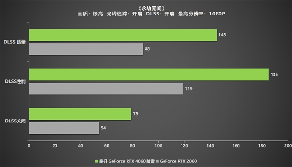 开启DLSS 技术后,耕升 GeForce RTX 4060 踏雪的性能差距将更为明显。通过数据我们可以看到,在《永劫无间》中,耕升 GeForce RTX 4060 踏雪在开启DLSS 性能模式的情况下,帧数来到了惊人的185帧。而在DLSS质量模式下,耕升 GeForce RTX 4060 踏雪在保证流畅的同时,画面的质量也有一定的提升的同时,帧数也来到来到145帧,耕升 GeForce RTX 4060 踏雪较比GeForce RTX 2060的提升幅度高达30%。可见DLSS 技术的强力性能支持,对于游戏的体验优化相当重要。《永劫无间》官方也提到,将在往后的更新中添加DLSS 3的支持,相信那时耕升 GeForce RTX 4060 踏雪所带给玩家的体验将会更为流畅。