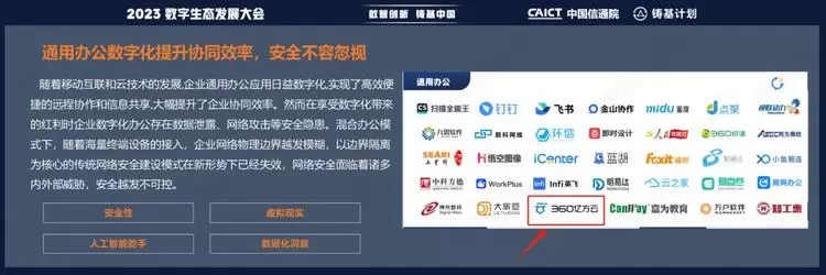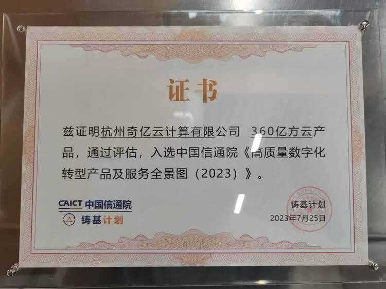 大会发布了“铸基计划”《高质量数字化转型产品及服务全景图(2023)》,360亿方云成功入选全景图中的高质量数字化转型云服务产品名录。