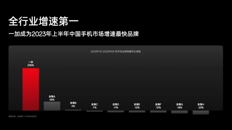 现在,这个问题已经不言自明:从产品的角度,今年上半年一加发布的一加11、一加Ace 2、一加Ace 2V都成了各个价位段的王者;从增长来看,一加成为2023年上半年中国手机市场增速最快的品牌,唯一一个连续6个月保持3位数增速;从反馈来看,一加的手机也收获了太多的媒体好评和用户认可。
