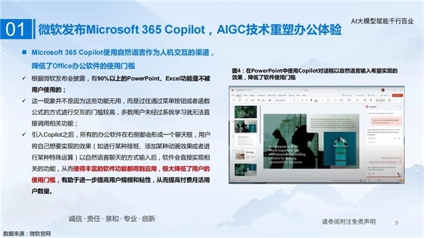 此前,微软推出Microsoft 365 Copilot订阅服务,并已嵌入到Word、Excel、PowerPoint、Outlook、Teams等用户高频使用的各类办公软件中,以自然语言作为人机交互的渠道,降低了Office办公软件的使用门槛,帮助用户从繁琐的事务性工作中解放出来,让用户更专注于创造性工作,从而提高办公效率。研报表示,微软推出的Microsoft 365 Copilot订阅服务用AIGC技术重塑办公体验,为用户办公模式带来革命式的变化。