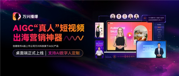 面向AI+电商及AI+营销方向,万兴科技推出国内首款跨境全场景数字人服务的AI视频创意软件万兴播爆,并已创新集成AI生成脚本功能,为用户带来从脚本、到“真人”出镜、到视频自动生成的“全链路AIGC创作”体验,用户输入一段文案,即可快速生成多国籍数字人营销视频,并可使成本投入降低至原先的1/5,大幅提升用户的生产效率,规模化推动跨境短视频创作效率升级。