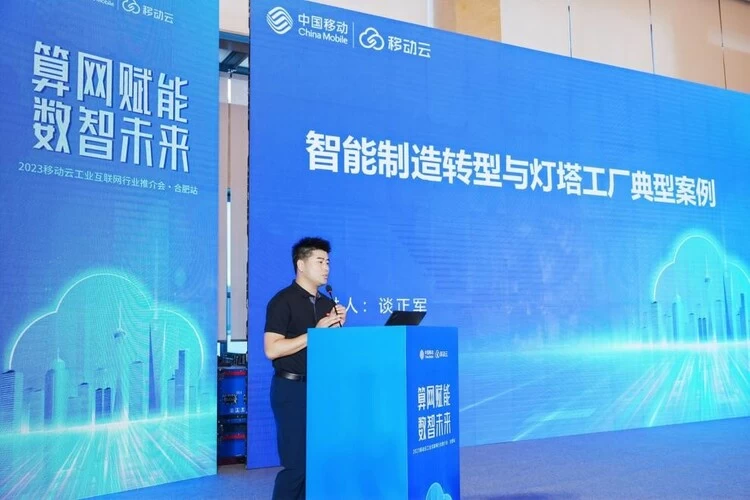 会议最后,中国移动优 秀合作伙伴联宝(合肥)电子科技有限公司数字化总监谈正军从联宝科技数字化转型路径“现身说法”,通过三化融合、四个打通,实现了自身的智能制造转型,同时,结合灯塔工厂的典型案例做出分享,为企业数字化、智能化带来了新的思路。