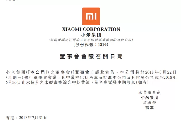 小米集团(1810.HK)在其官网发布公告称,将于8月22日举行董事会会议,其中议程包括考虑及批准小米集团和附属公司2018年上半年之中期业绩。这也是小米集团上市后披露的首份财报。据悉,按照惯例,雷军届时将在香港进行业绩发布会,并答记者问。