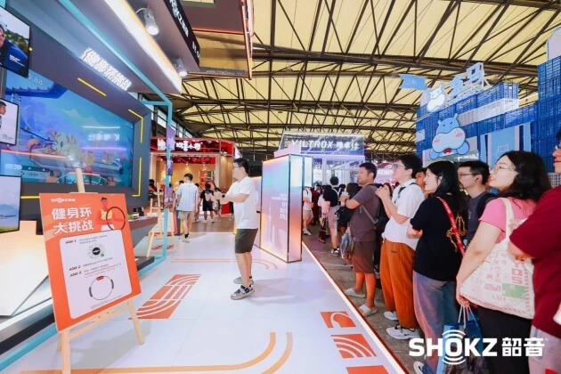 Shokz韶音的火爆从展台前络绎不绝的人潮就可见一斑!开幕当天不到9点,韶音展台前已经是被挤得水泄不通,而展台前另一个健身环挑战项目更是展会的明星打卡点,前来体验的观众们时长排起长队。其实这一点都不令人意外,当我们深入分析运动跟娱乐的关系,就会发现两者完全是天然CP。运动会分泌两种快乐物质——多巴胺和内啡肽,这不正是很多人想从娱乐中获得的体验吗?