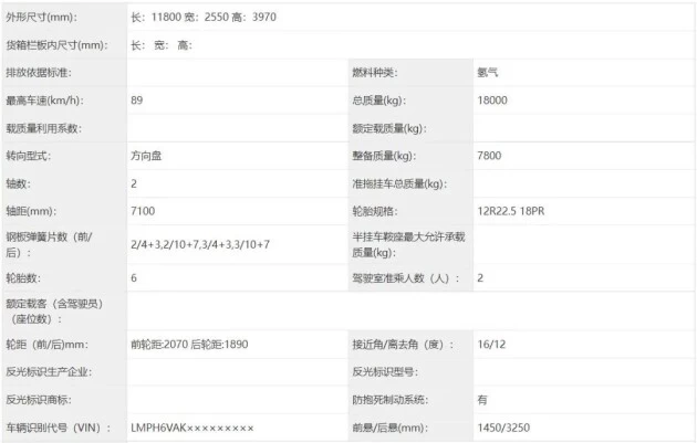 公示信息显示,远程新款甲醇重整制氢载货底盘产品型号DNC1188FCEVGMPJ1,外形尺寸11800×2550×3970mm,轴距7100mm。总质量18000kg,整备质量7800kg。动力方面,整车搭载广东能创科技生产的甲醇重整制氢发动机、博世氢-空型质子交换膜燃料电池;匹配微宏动力锰酸锂蓄电池,配装苏州绿控传动TZ310XS-LKM0824永磁同步电机,额定功率112kW,峰值功率246kW,最高车速89km/h。