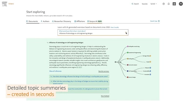 ·即将新增“图像演示法”功能,为相互关联的研究主题提供了新视角:Scopus AI 将能够对搜索结果进行可视化呈现,以全面直观的概览图示,帮助科研人员轻松梳理课题之间原本复杂的关系。