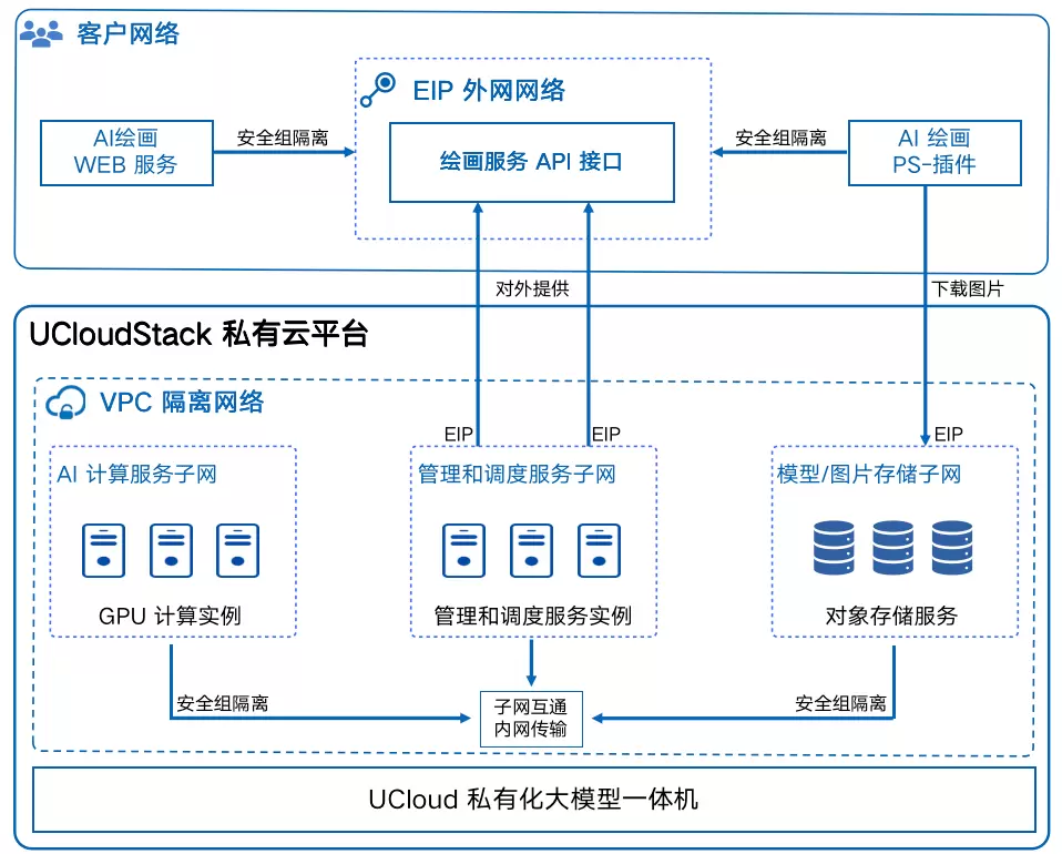 ●外网 IP网络和客户内网在同一个网络面,AI绘画 WEB 客户端和 PS 插件可直接通过 网络访问API服务,并可通过外网安全组进行网络访问控制和隔离。