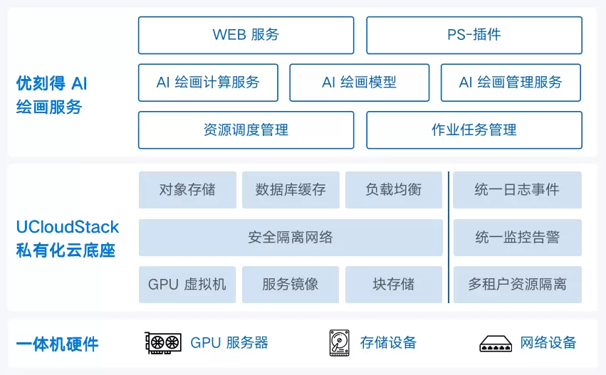 UCloud优刻得大模型一体机打包了GPU服务器、磁盘及通用网络设备,为AI绘画大模型提供IaaS层虚拟化、GPU虚拟机、服务镜像、块存储及安全隔离网络,可快速部署并运行资源调度、进行作业任务管理、AI绘画计算服务、AI绘画管理及接口服务。通过负载均衡服务实现管理服务接口高可用、负载分发,保证绘画业务的可用性。