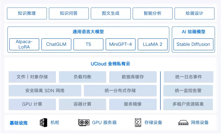 为实现大模型私有化交付,UCloud优刻得大模型一体机,基于一云多芯且自主可控的UCloudStack全栈私有云平台,提供虚拟化、存储、网络及MaaS模型的私有化一体交付方案,支持Alpaca-LoRA、ChatGLM、T5、MiniGPT-4、Stable Diffusion、LLaMA2及Milvus向量数据库等开源模型的部署及算力调度,用户可在本地或自有数据中心内,轻松部署针对特定场景的大模型服务。